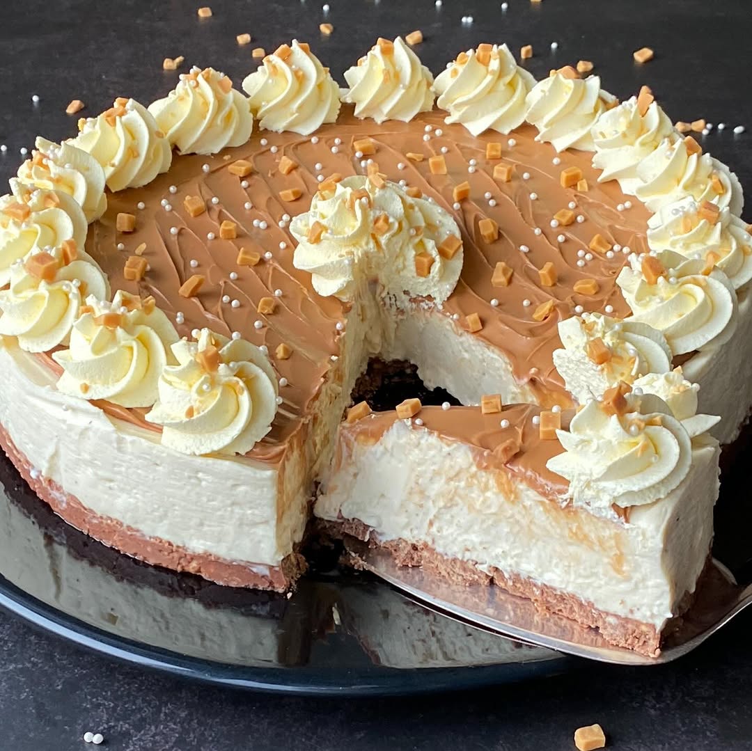 • Réchauffer légèrement la pâte à tartiner caramel pour l'assouplir si nécessaire. Étaler uniformément sur la surface du cheesecake bien pris à l'aide d'une spatule coudée. Remettre quelques minutes au frais pour que le caramel se raffermisse.